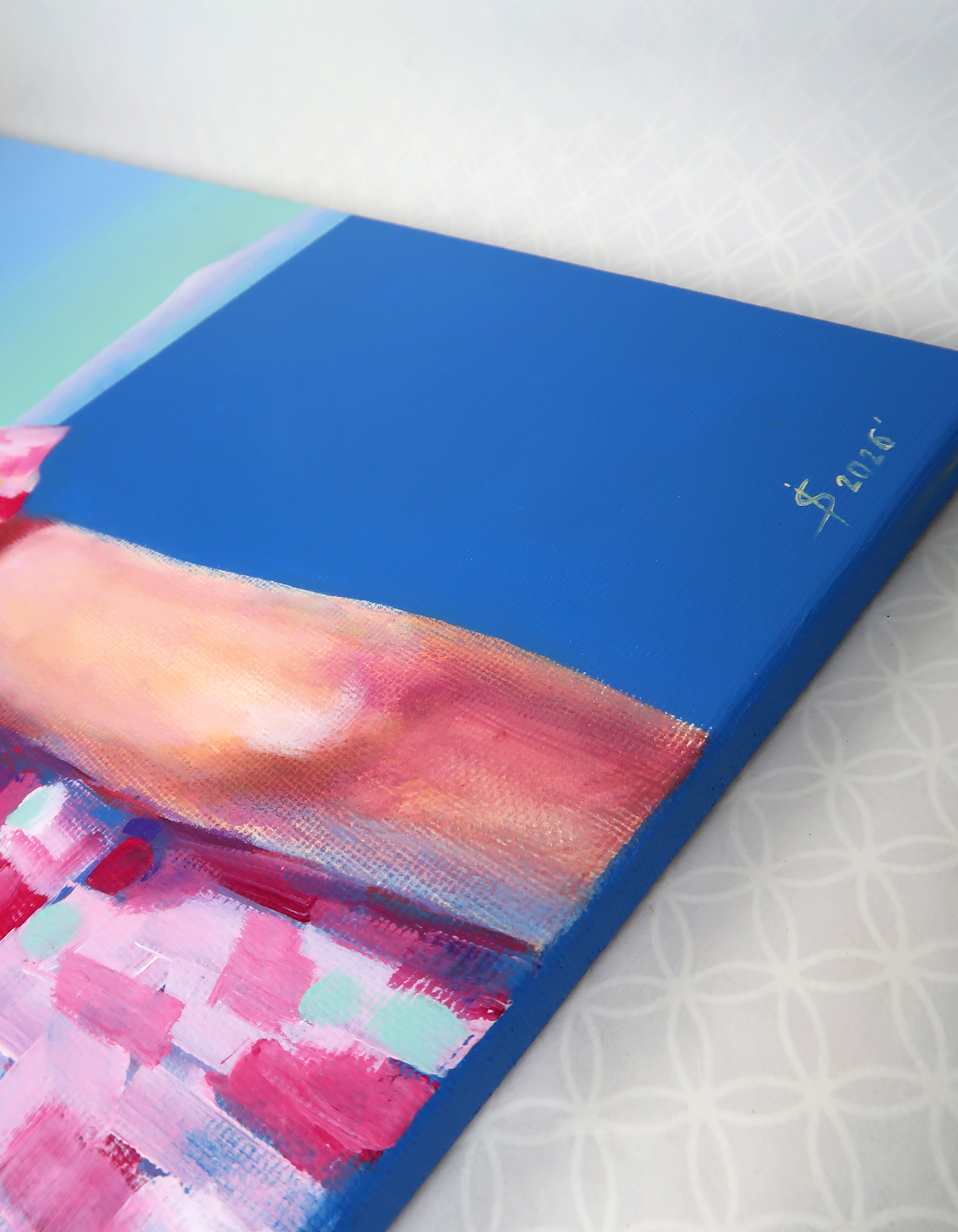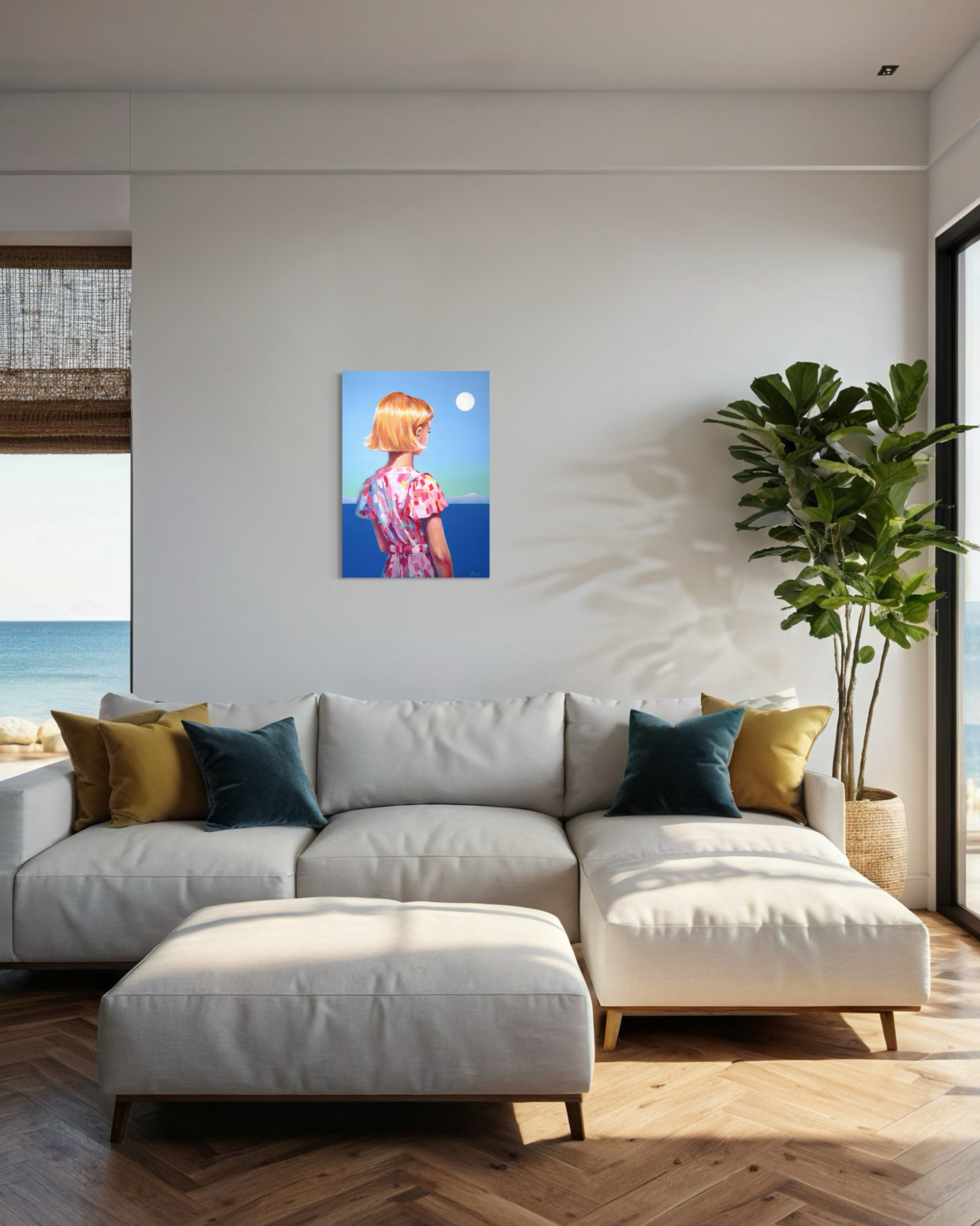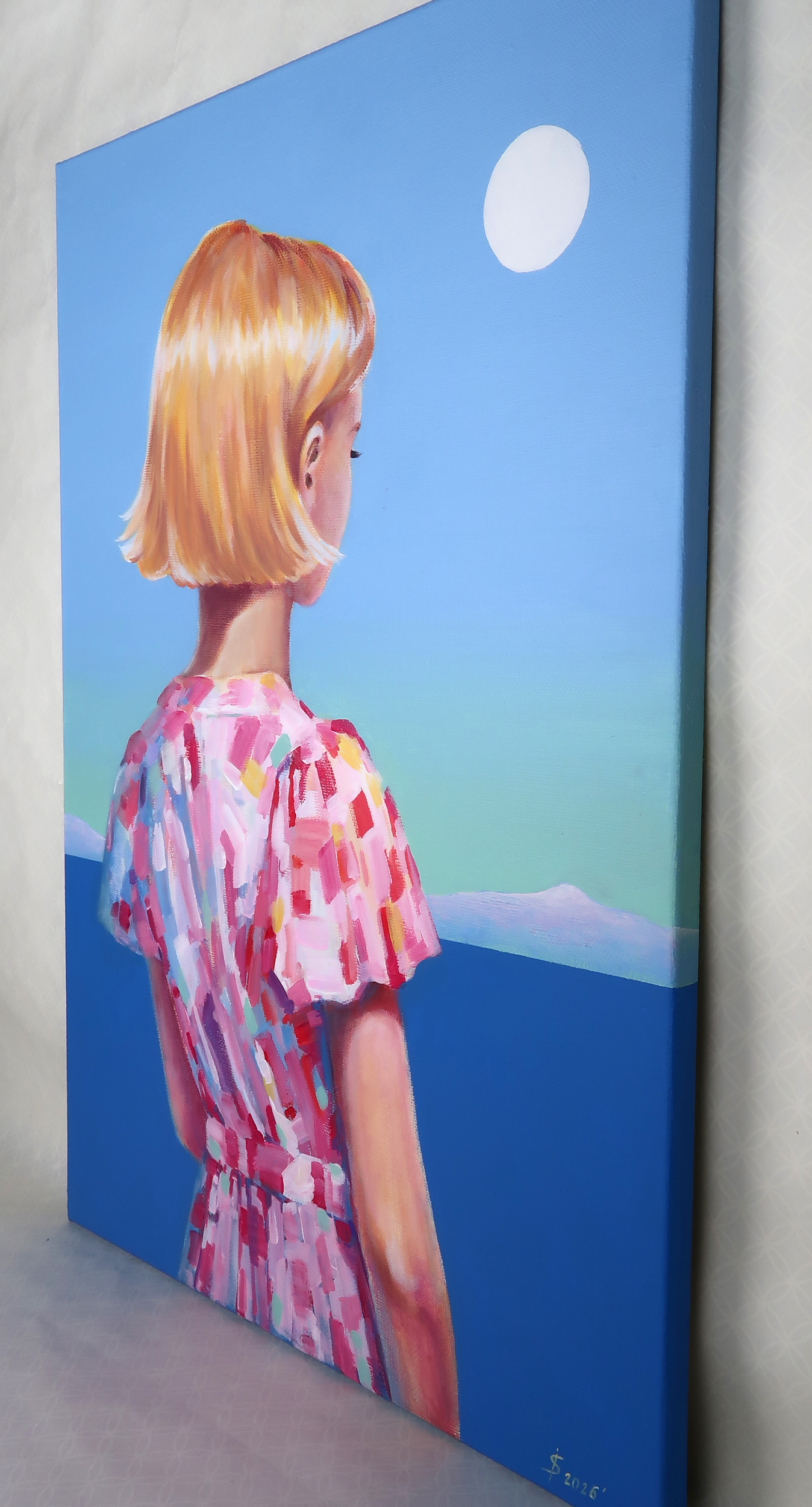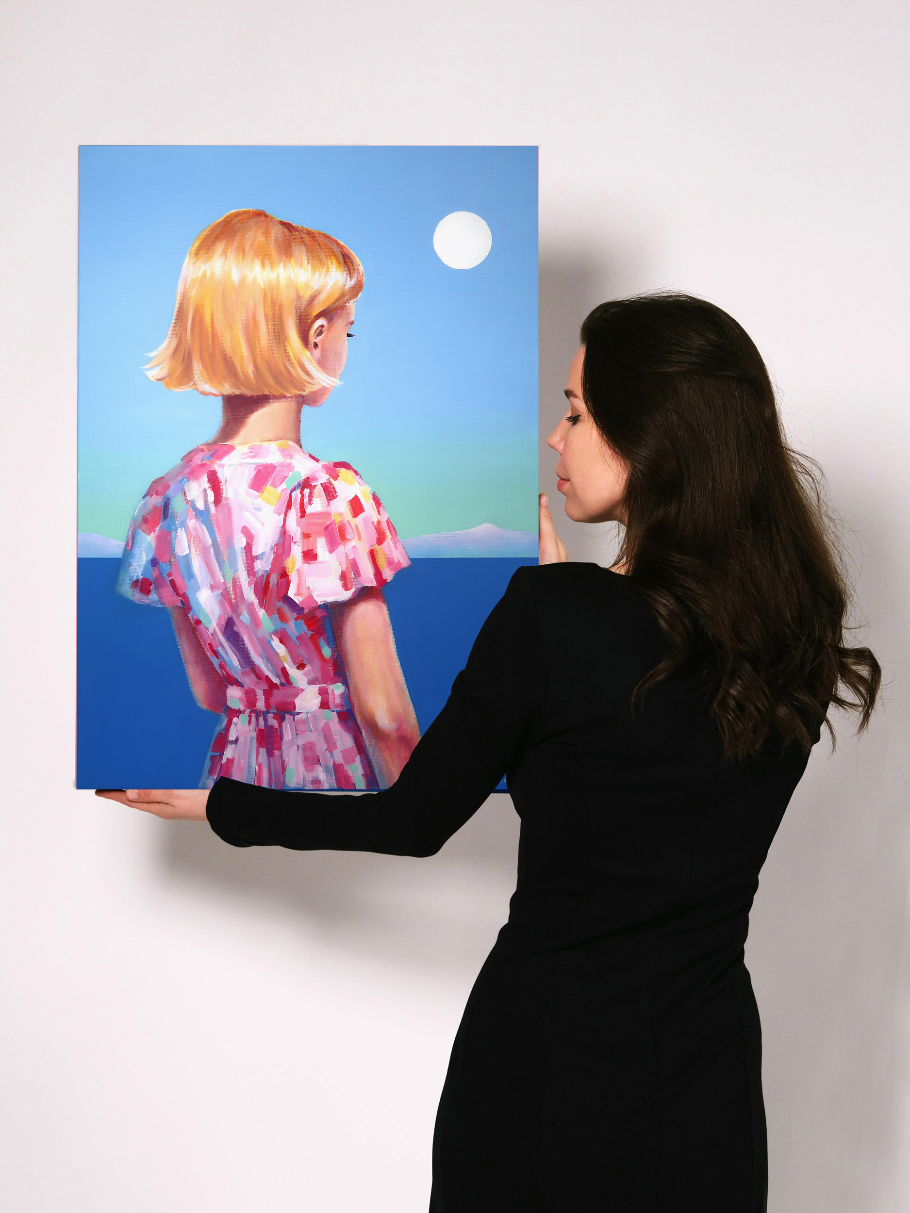 Картина «Взгляд в бесконечность» — это тонко выстроенный визуальный диалог о природе времени и вечных ценностях через призму символизма. Используя образы моря, гор, луны и фигуры юной девушки, автор создает пространство для философского размышления о быстротечности жизни и поиске внутреннего смысла. Фигура девушки выступает здесь как метафора юности, чистоты и хрупкости бытия. Её короткие золотистые волосы, словно впитывающие свет солнца, становятся символом мимолетности счастливых мгновений. Взгляд, устремлённый в бесконечность, передаёт глубину экзистенциального поиска — стремление понять себя и своё место в мире. Минималистичный фон, выполненный в нежных голубых тонах, не отвлекает, а создает атмосферу умиротворения и сосредоточенности. Он словно приглашает зрителя к медитативному погружению в чувства и внутренние переживания героини, позволяя каждому найти собственный отклик в этом пространстве. Эта работа —тонкое исследование человеческой души, запечатленное через поэтику образов и цвета.