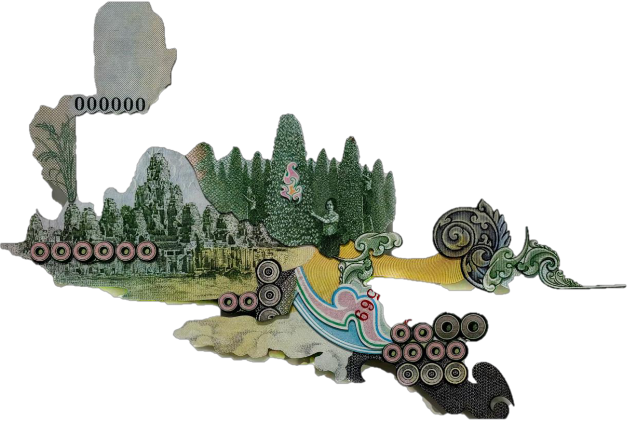 Техника: Металл, УФ-печать. В работе использованы фрагменты: 1000 riel / 1992 Комбоджа, 10 riel / 1995-1998 Комбоджа, 10 riel / 1955 Первое Королевство Комбоджи. Тираж 1