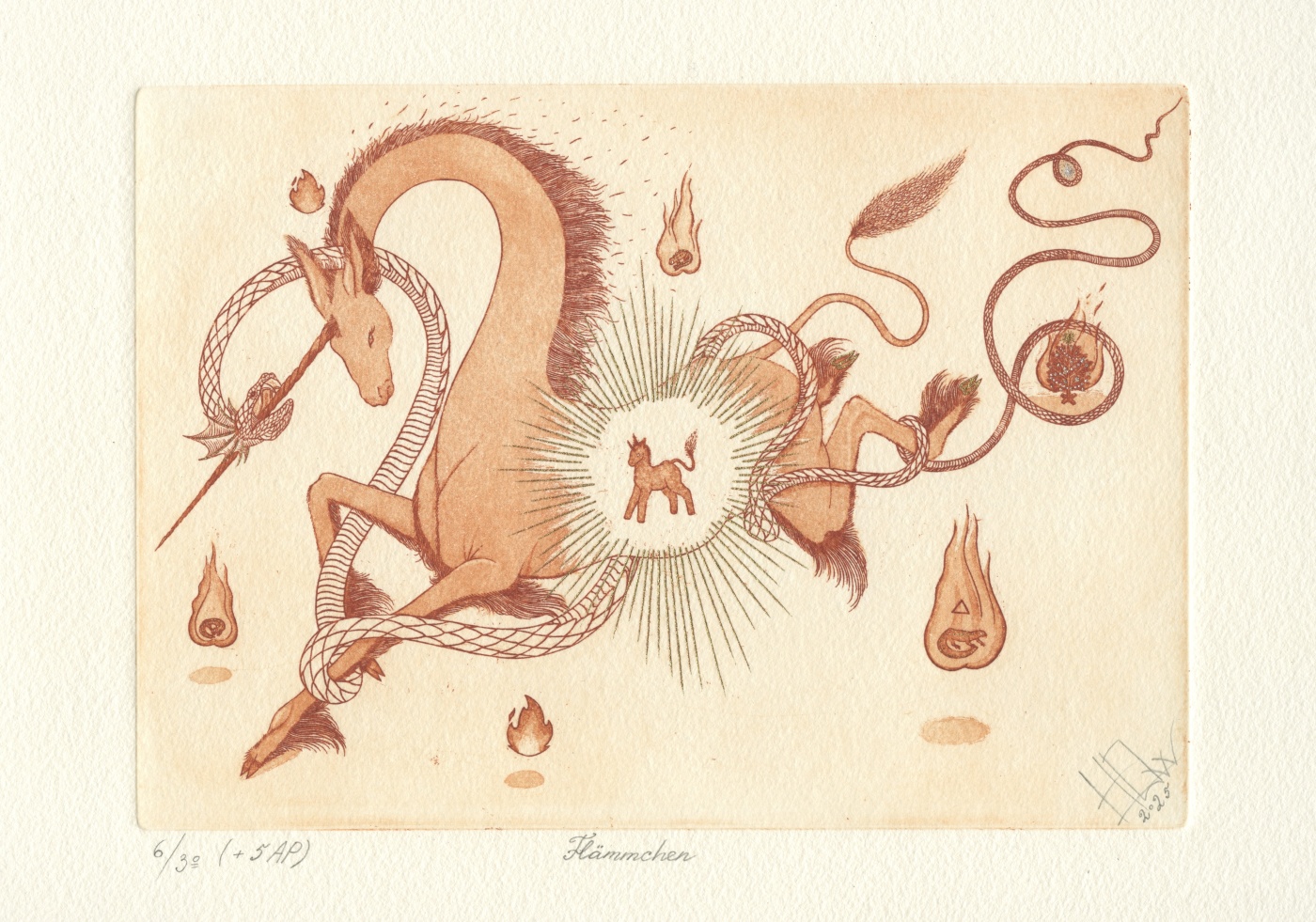 Единорог попирает Змея - это знак победы над сомнениями, страхами и внутренними препятствиями, которые мы оставляем в 2025-м, в Году Змеи. Вокруг нее парят маленькие огоньки-emoji и главные жители огненной стихии - саламандры - существа, которые чувствуют себя в огне естественно, свободно и привольно. Очень хочется верить, что и мы сможем прожить наступающий огненный год так же: цельно, смело и вдохновенно! Эта работа - тёплый «Огонёк» художницы на пороге 2026 года!