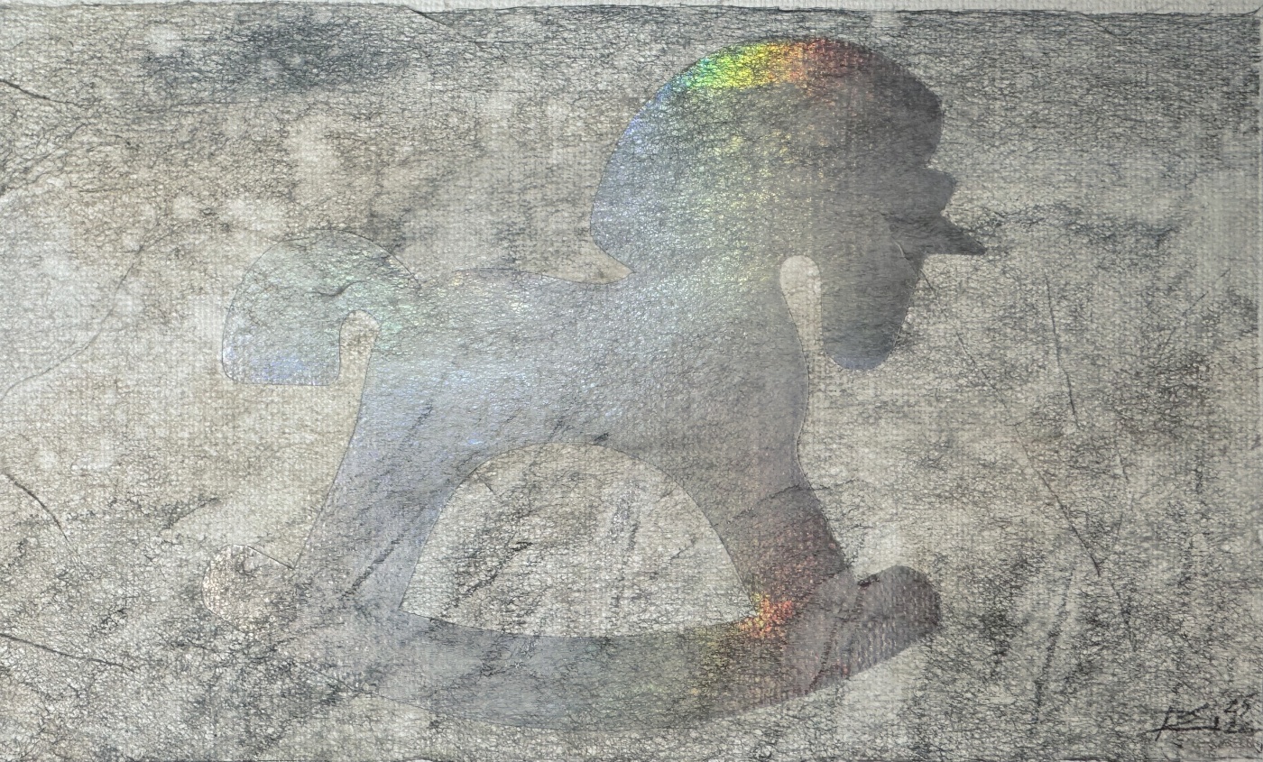 Образ советской лошадки-каталки интегрируется с современным символом, понятным новому поколению, переливаясь и исчезая, создавая эффект туманности. Тончайшая японская бумага предварительно тонируется в авторской технике и местами напоминает сотканную тончайшую вуаль.