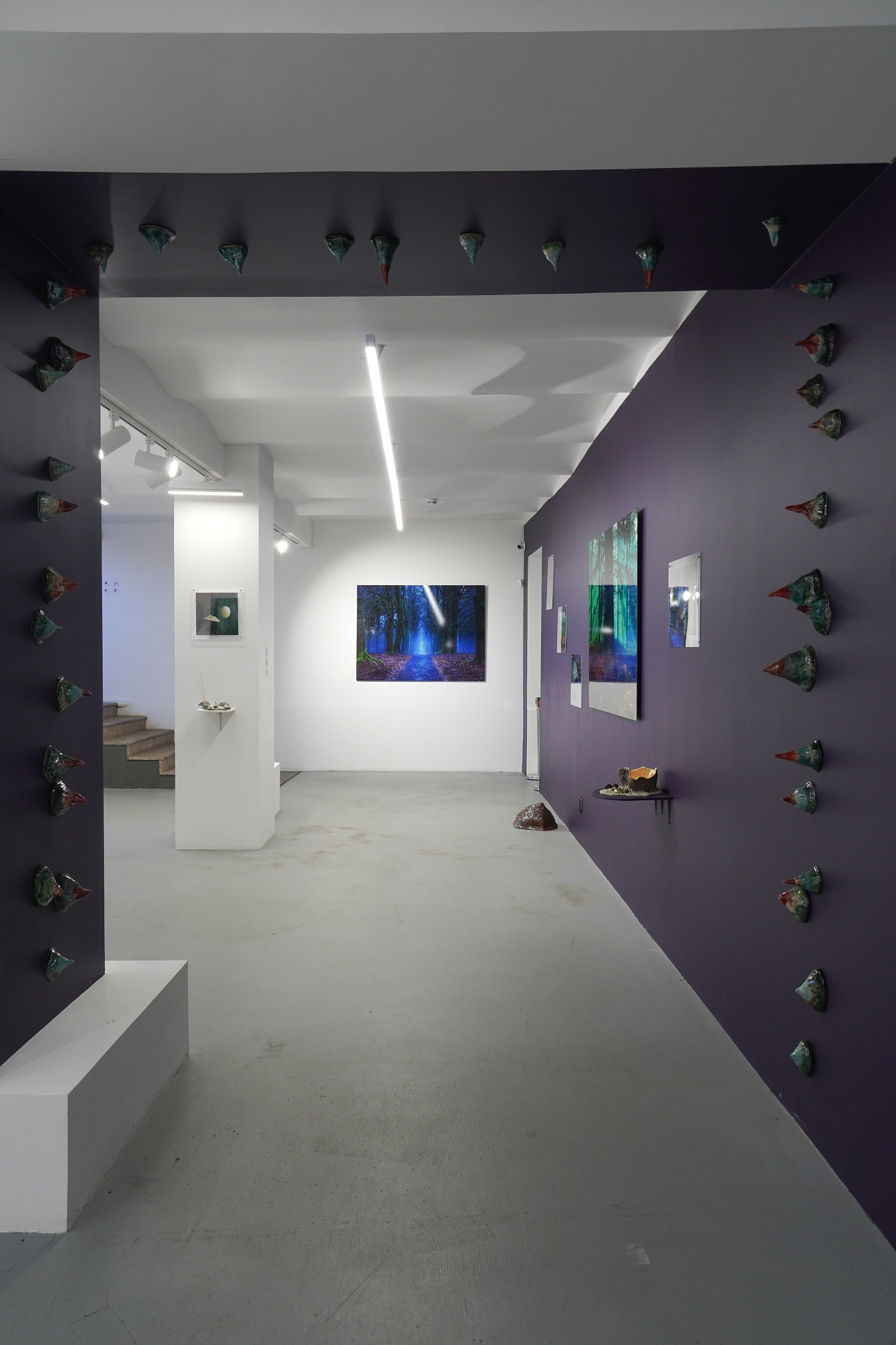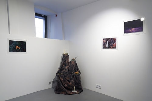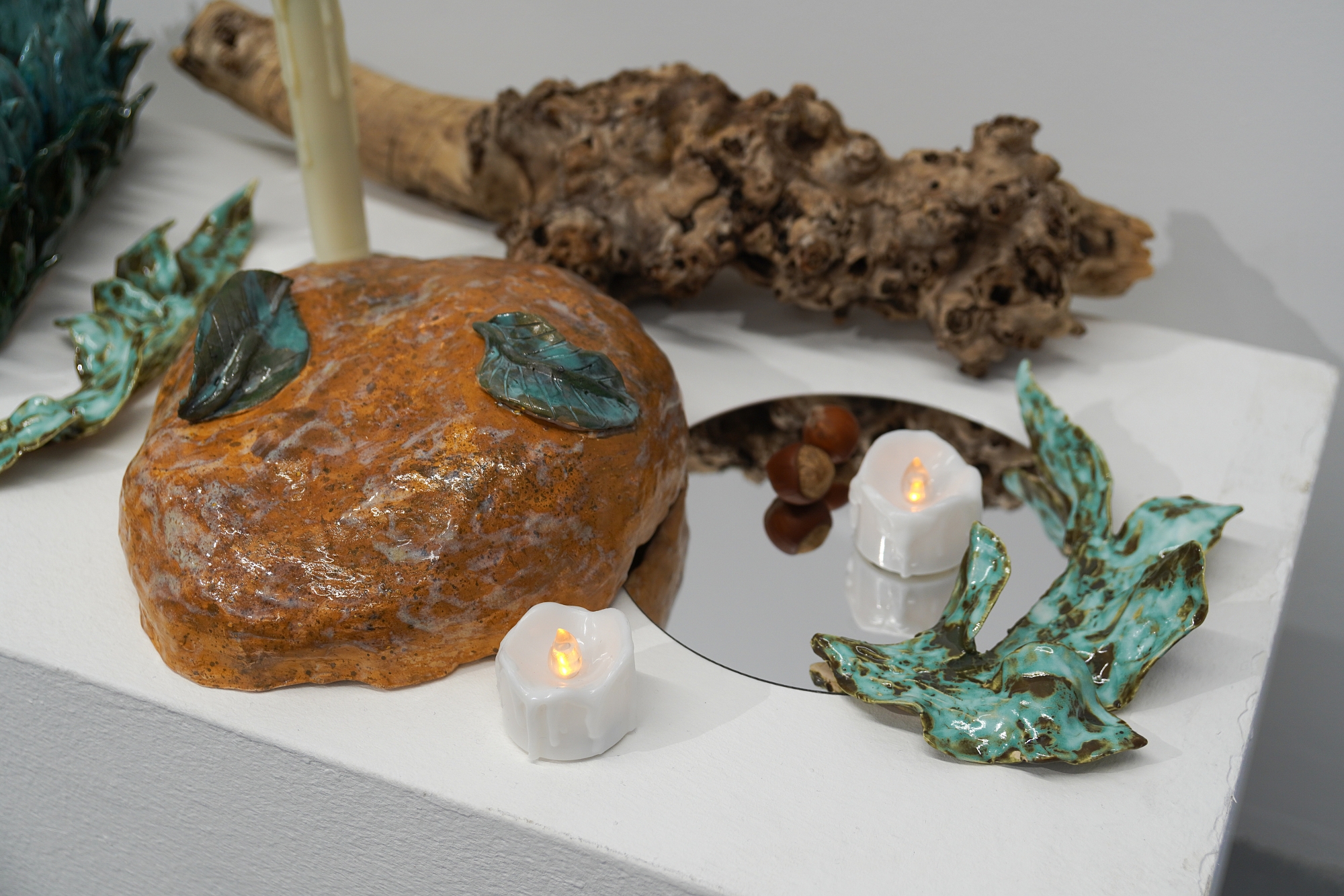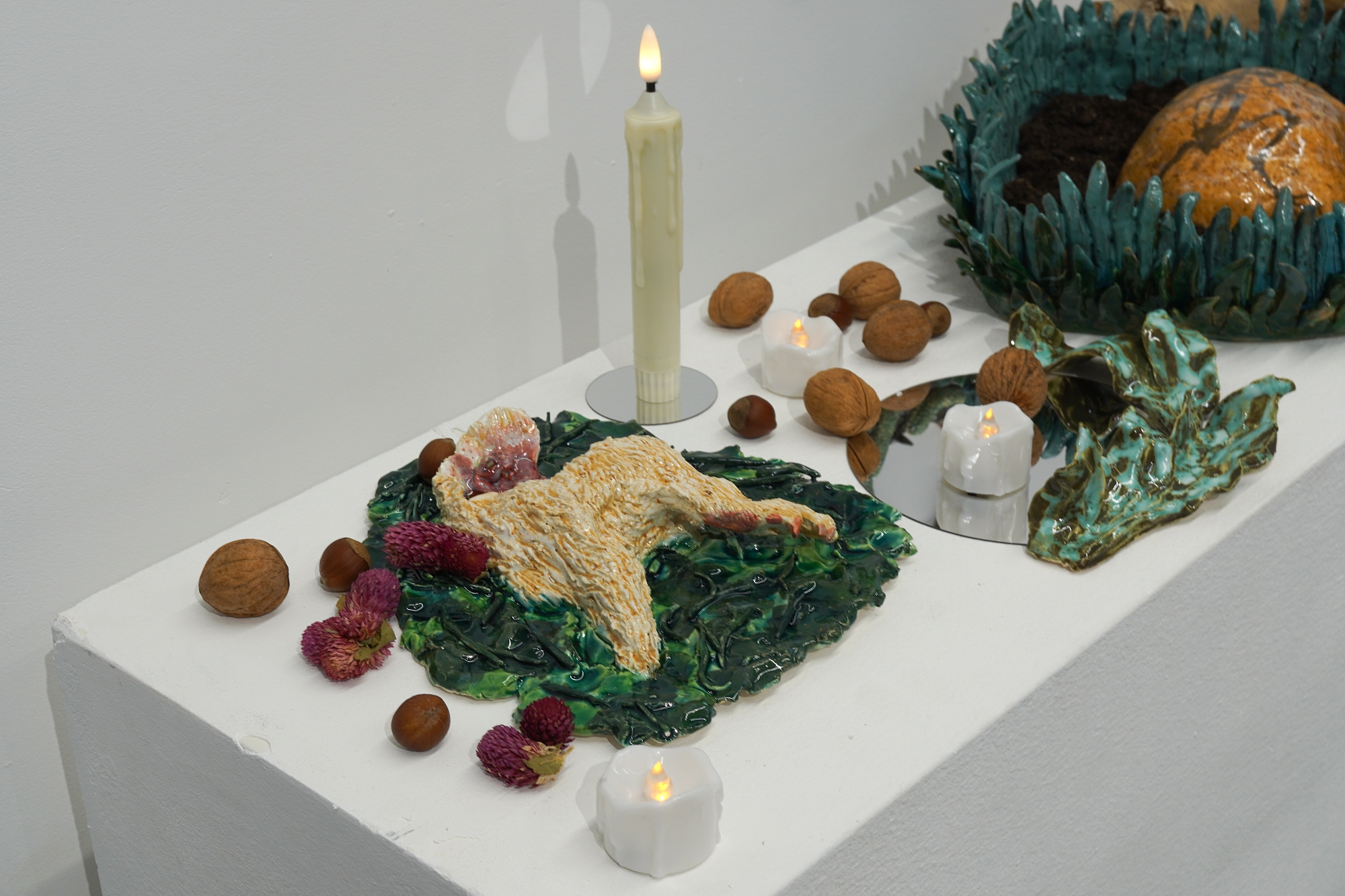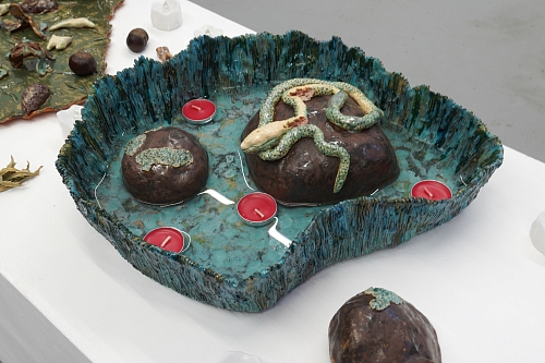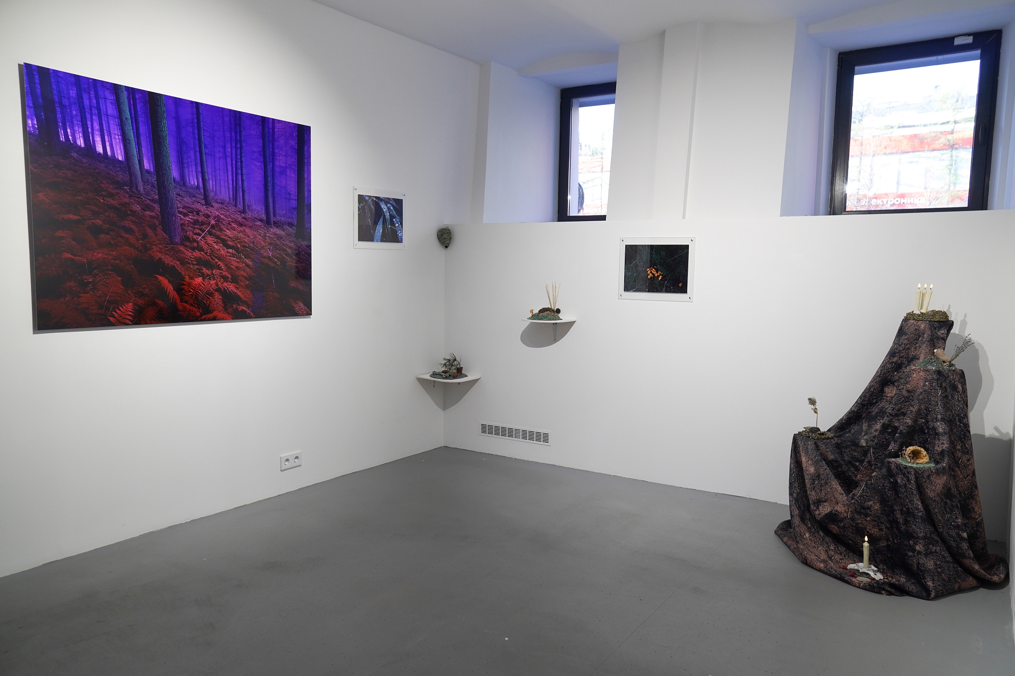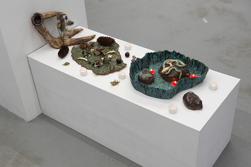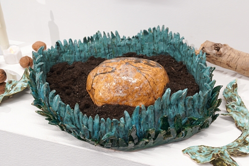 Дополняют выставку керамические работы Ольги Божко, чьи формы и фактуры тонко перекликаются с темой сумерек. Каждая скульптура — это своеобразный лесной алтарь – жертвенник, посвящённый суровым законам природы, как напоминание о жестокой красоте естественного отбора. А тонкие ароматы, наполняющие галерею узнаваемыми запахами сырой земли, свежего дождя, лесной хвои и дыма, дополняют чувственный опыт посетителей, предлагая зрителю прочувствовать и прожить завораживающее очарование сумеречного времени.