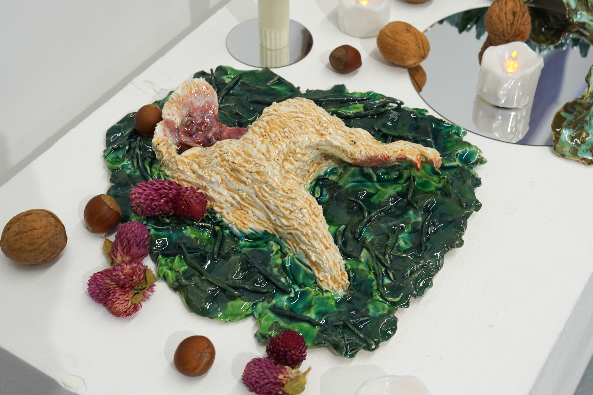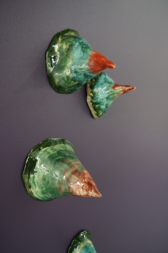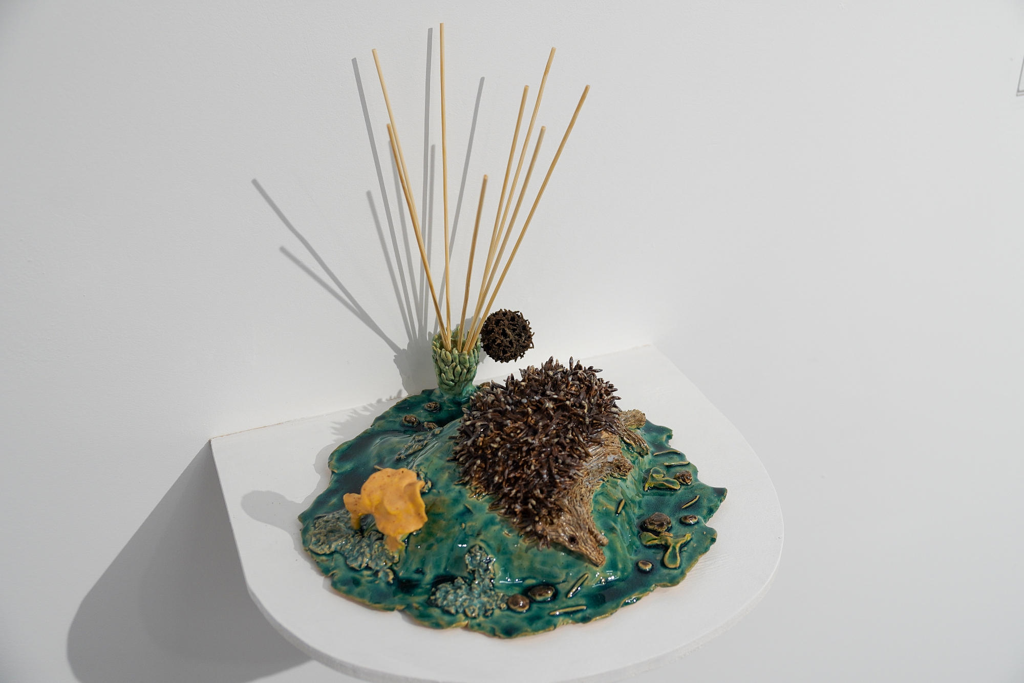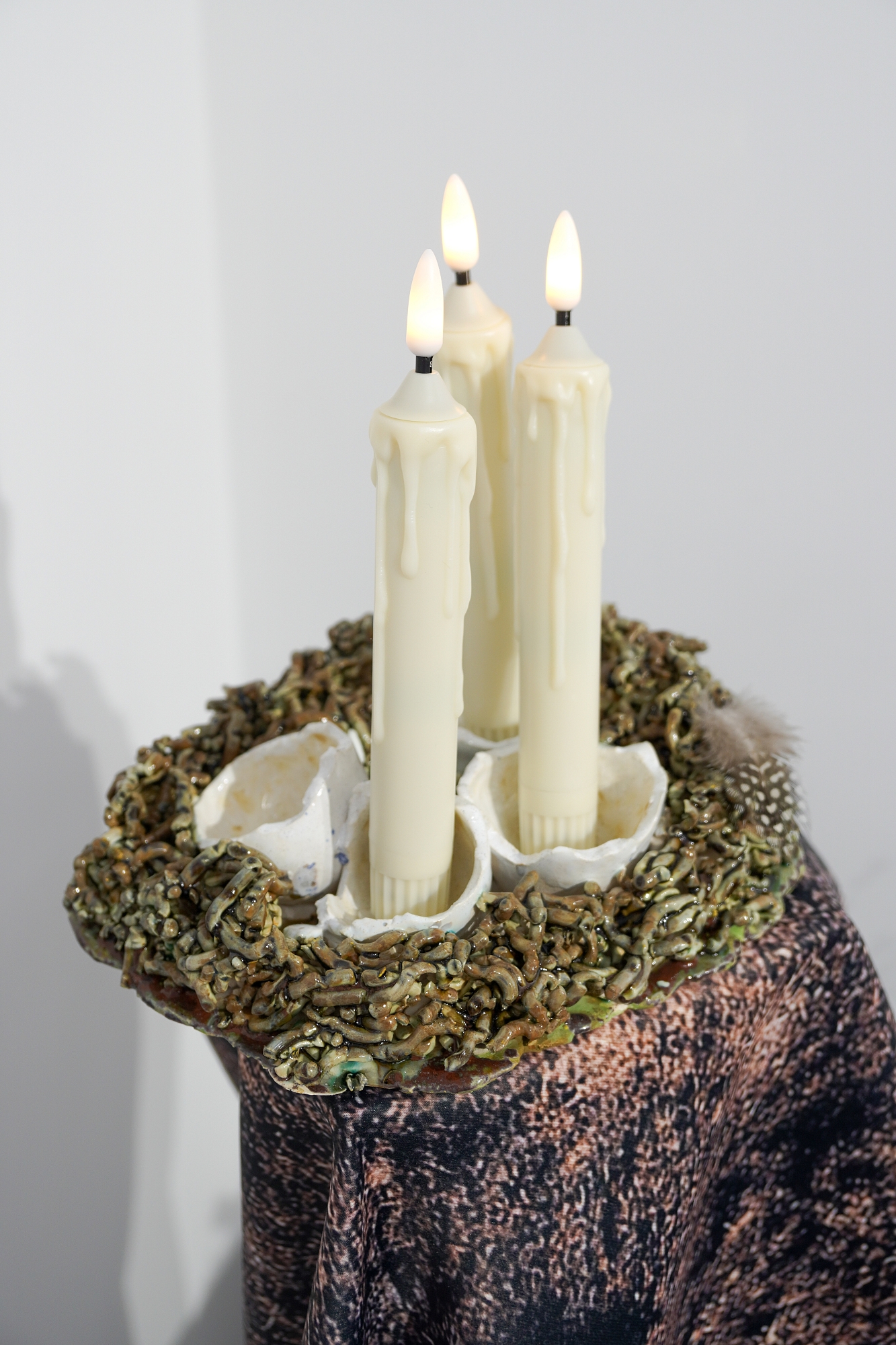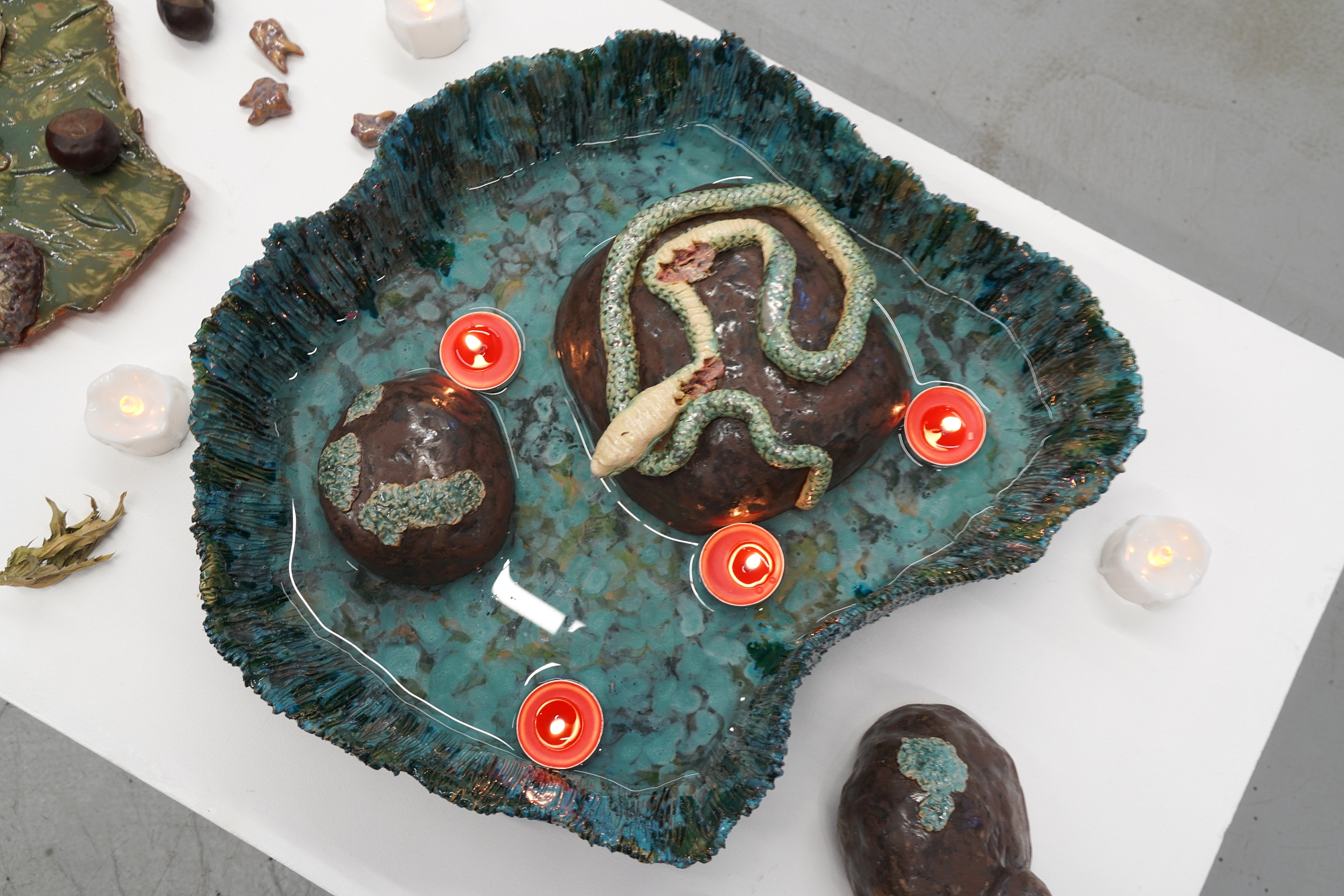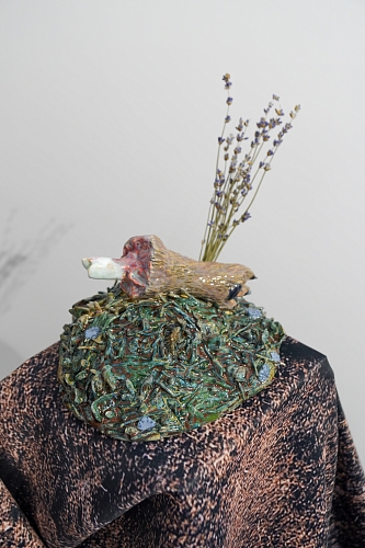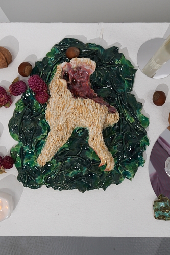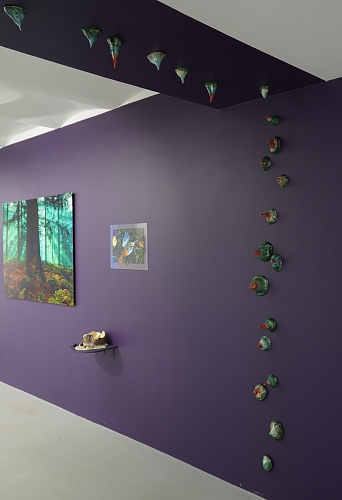 Дополняют выставку керамические работы Ольги Божко, чьи формы и фактуры тонко перекликаются с темой сумерек. Каждая скульптура — это своеобразный лесной алтарь – жертвенник, посвящённый суровым законам природы, как напоминание о жестокой красоте естественного отбора. А тонкие ароматы, наполняющие галерею узнаваемыми запахами сырой земли, свежего дождя, лесной хвои и дыма, дополняют чувственный опыт посетителей, предлагая зрителю прочувствовать и прожить завораживающее очарование сумеречного времени.