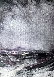Коллажная графика с применением разных техник ручного окрашивания бумаги ( японская бумага ручной работы, акрил, красители, чернильные карандаши, пастель, нанесение типографской краски на металлизированную бумагу). Область изображения 10х15см.