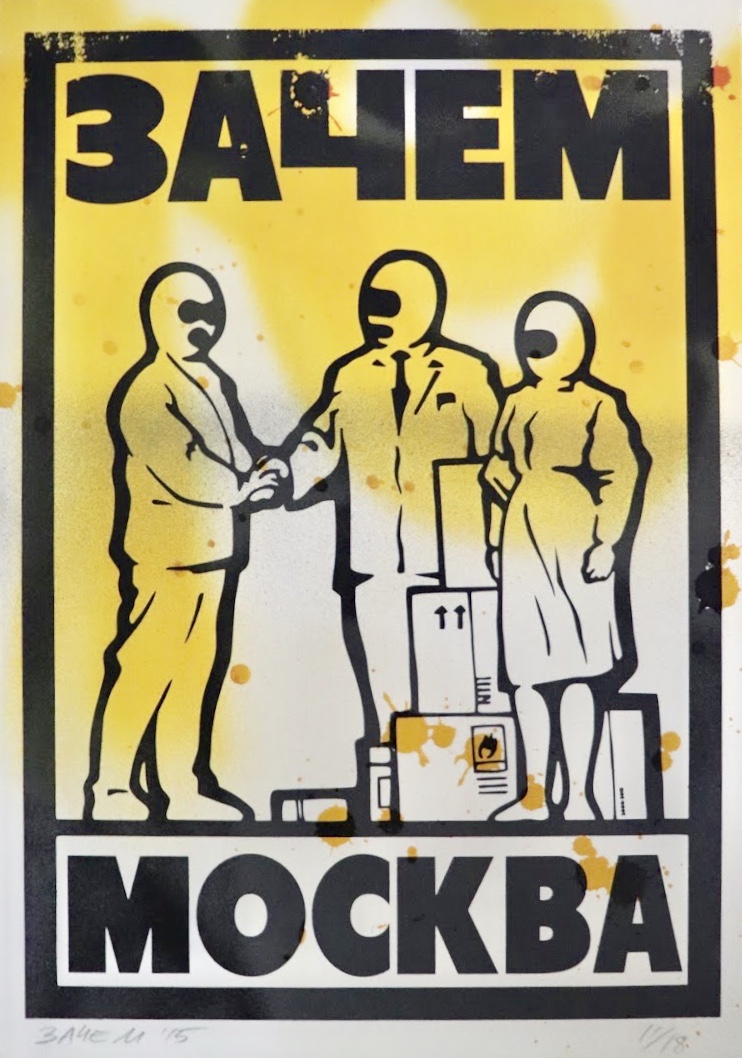 В отличие от официальных художников, участники «Зачем» о себе стараются ничего не рассказывать. Их граффити до сих пор остаётся действием противозаконным, основанным на адреналине. Понять её полностью так же невозможно, как и идеологию анархо-индивидуализма. У ребят из группы «Зачем», граффити которых появляется по принципу хаотичного захвата городского пространства, у них в приоритете личное, индивидуальное видение сиюминутного действия. В какой-то период они оставляют надписи на стенах, потом переключаются на поезда и вагоны московской подземки, потом переходят к дверям магазинов. На сайтп представлена эксклюзивная серия из четырех принтов с авторской печатью на окрашенной вручную итальянской хлопковой бумаге. Первый и, возможно, последний раз, когда представители команды ЗАЧЕМ тиражируют работы в технике шелкографии. Черные отпечатки нанесены участниками команды на специально подготовленную бумагу. Каждый принт уникален - фон изображения ни разу не повторяется. Четыре работы совместно составляют уникальный квадриптих с единым фоном.
