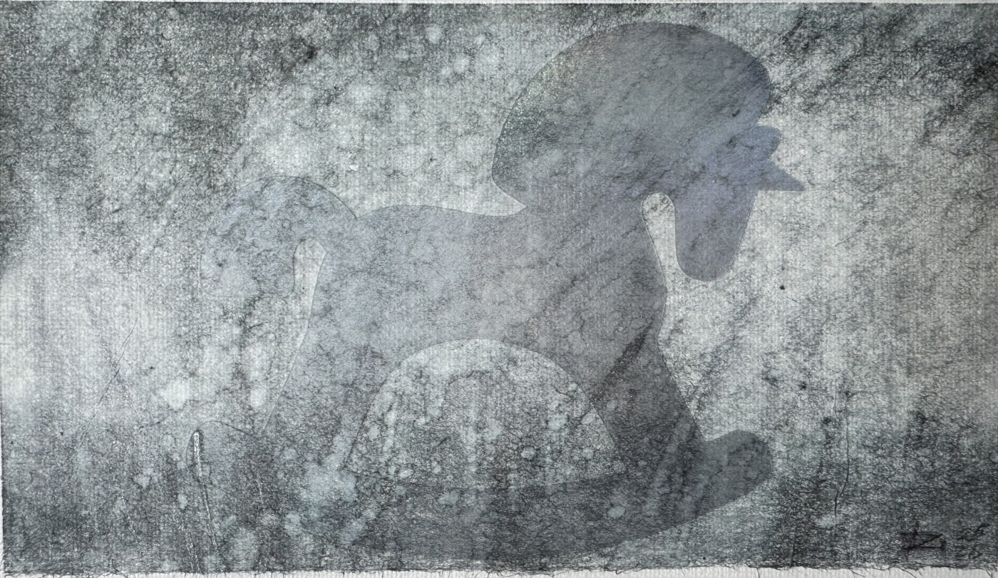 Образ советской лошадки-каталки интегрируется с современным символом, понятным новому поколению, переливаясь и исчезая, создавая эффект туманности. Тончайшая японская бумага предварительно тонируется в авторской технике и местами напоминает сотканную тончайшую вуаль.