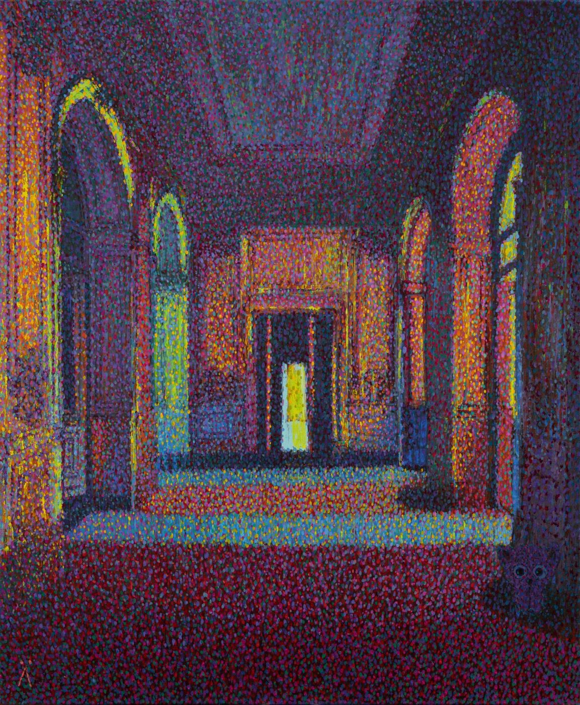 Леша работает в технике пуантилизма, которая позволяет в полной мере реализовывать идеи художника.