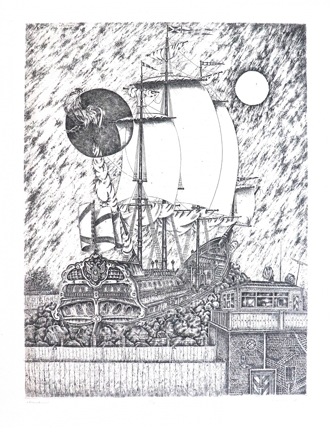 Александр Ильич Калугин родился в 1949 в Нарве, Эстония. Живёт и работает в Москве Учился в студии художника Владимира Вейсберга (1965–1967) и мастерской Бориса Козлова (1970–1971) в Москве. Он участвовал в первых неформальных московских выставках – в Измайловском парке и Павильоне культуры на ВДНХ (1974), в квартирных выставках (1972-1982). Но затем его творческая судьба сложилась таким образом, что, работая в Москве, выставлялся он (с 1972 г.) исключительно в зарубежных странах. Первая выставка в России после столь затянувшегося перерыва состоялась в 1994 в Галерее “Файн Арт”. А.Калугин создает свою собственную мифологию в картинах и рисунках. Это сцены из жизни “чудесного” народа, в которых фантастическим образом переплелись реалии прошлого и настоящего, действительного и придуманного миров. Гротеск, ирония, сплав времен и характерных для них знаковых систем, личная причастность и вместе с тем значительное дистанционирование от реальной действительности порождают индивидуальный художественный контекст А.Калугина. Мир, предстающий в произведениях Калугина, - театр абсурда, режиссируемый автором, но соотносящийся ближе всего с русским менталитетом, с извечным способом русского человека жить приблизительно, абы как бы, но горячо мечтать о будущей прекрасной жизни, когда булки сыплются с неба, а рыбы величиной с дом скачут по улицам. И все, конечно же, пронизано горячей верой – Россия – родина слонов. Прекрасный, гордый парусник никуда не увезет мечтателей, так как выстроен в чистом поле и заблудился среди трех сосен – корабль дураков.