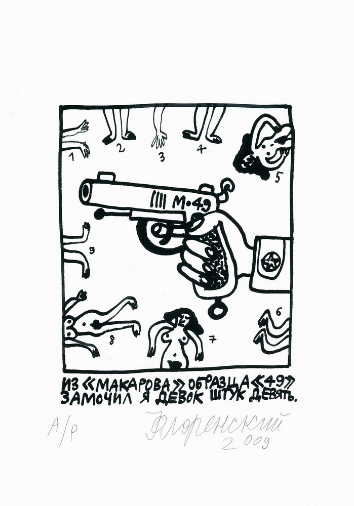 Александр Флоренский - художник, один из организаторов группы Митьки (80-е), автор иллюстраций к культовому трехтомнику Сергея Довлатова (90-е), участник проекта "Русское-Бедное" (00-е). В 2008 Александром Флоренским совместно с Дмитрием Бугаенко создана студия ручной печати Б&Ф (фото). Александр Флоренский живет и работает в СПб и Тбилиси.
