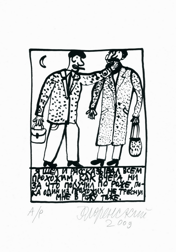 Александр Флоренский - художник, один из организаторов группы Митьки (80-е), автор иллюстраций к культовому трехтомнику Сергея Довлатова (90-е), участник проекта "Русское-Бедное" (00-е). В 2008 Александром Флоренским совместно с Дмитрием Бугаенко создана студия ручной печати Б&Ф (фото). Александр Флоренский живет и работает в СПб и Тбилиси.Публичные собрания: ГРМ (СПб), Третьяковская галерея (Мск), ГМИИ им.Пушкина (Мск) и др. художественные музеи России и Финляндии.