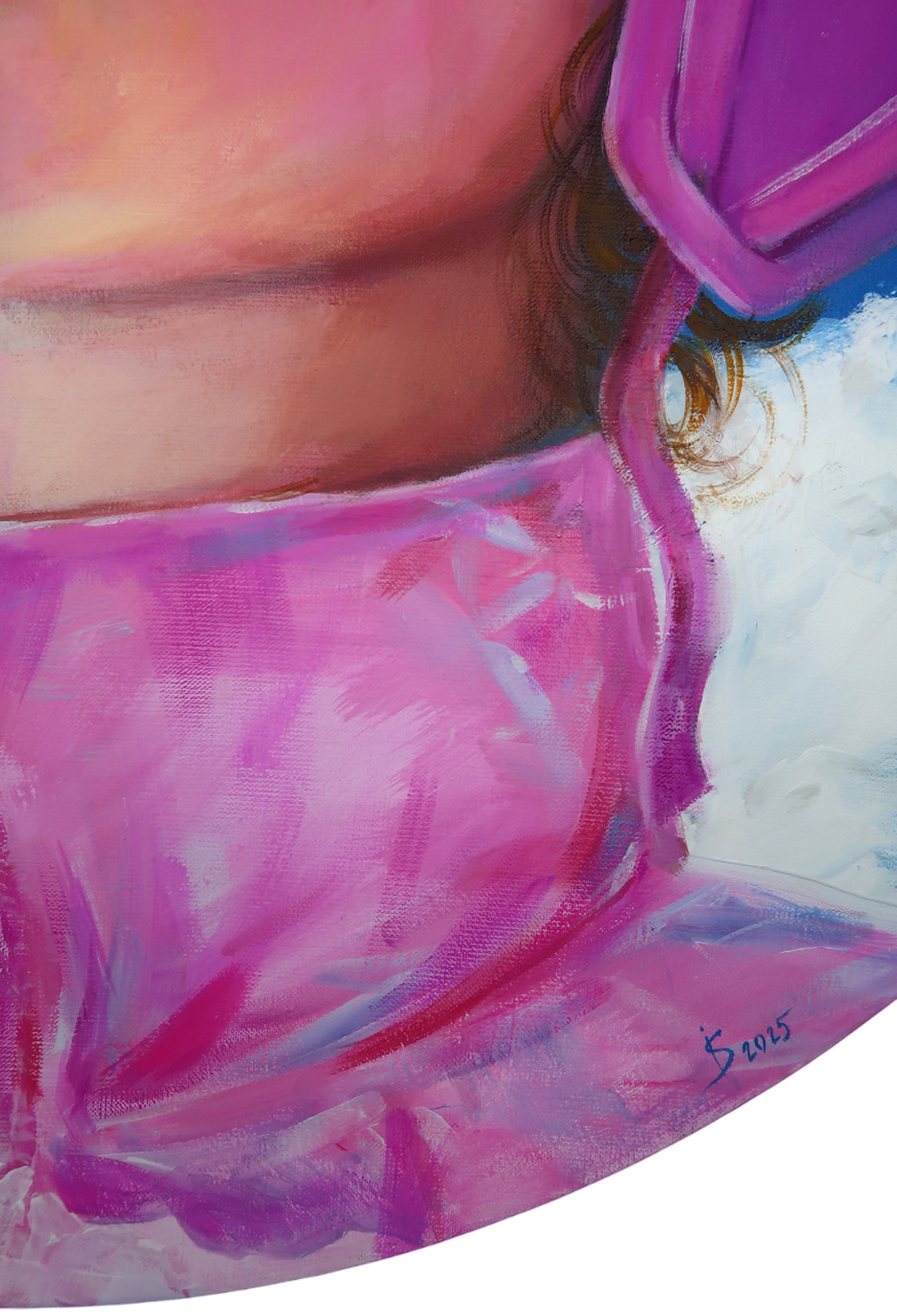 В центре композиции полотна «Сияние радости» раскрывается философия жизни, проживаемой в полноте настоящего момента. Образ девушки здесь выходит за пределы традиционного портрета, превращаясь в мощный символ свободы, внутренней уверенности и открытости к неизведанному. Ее присутствие напоминает зрителю о том, что свобода и счастье — универсальные ценности, доступные каждому, кто осмелится их искать.