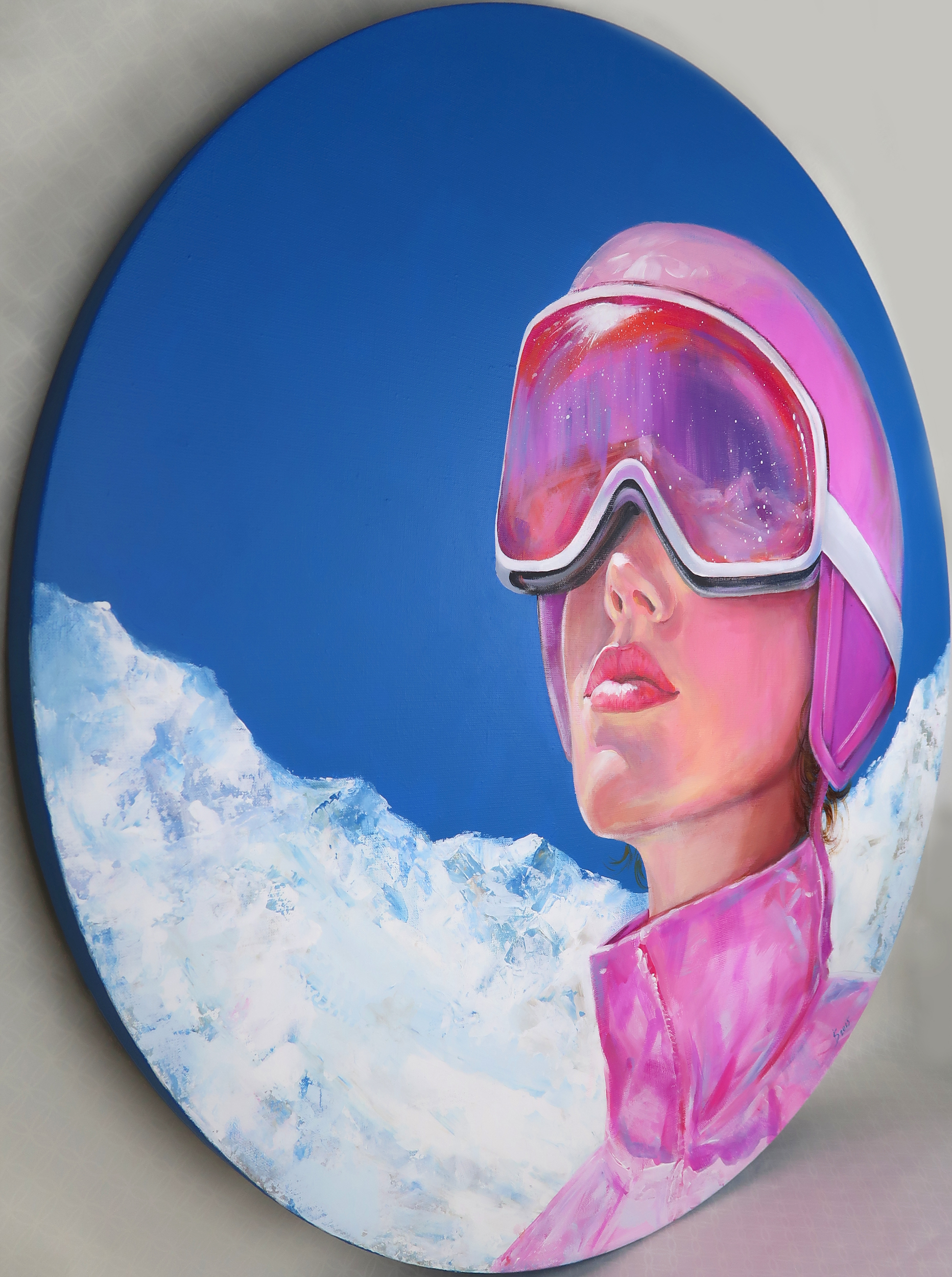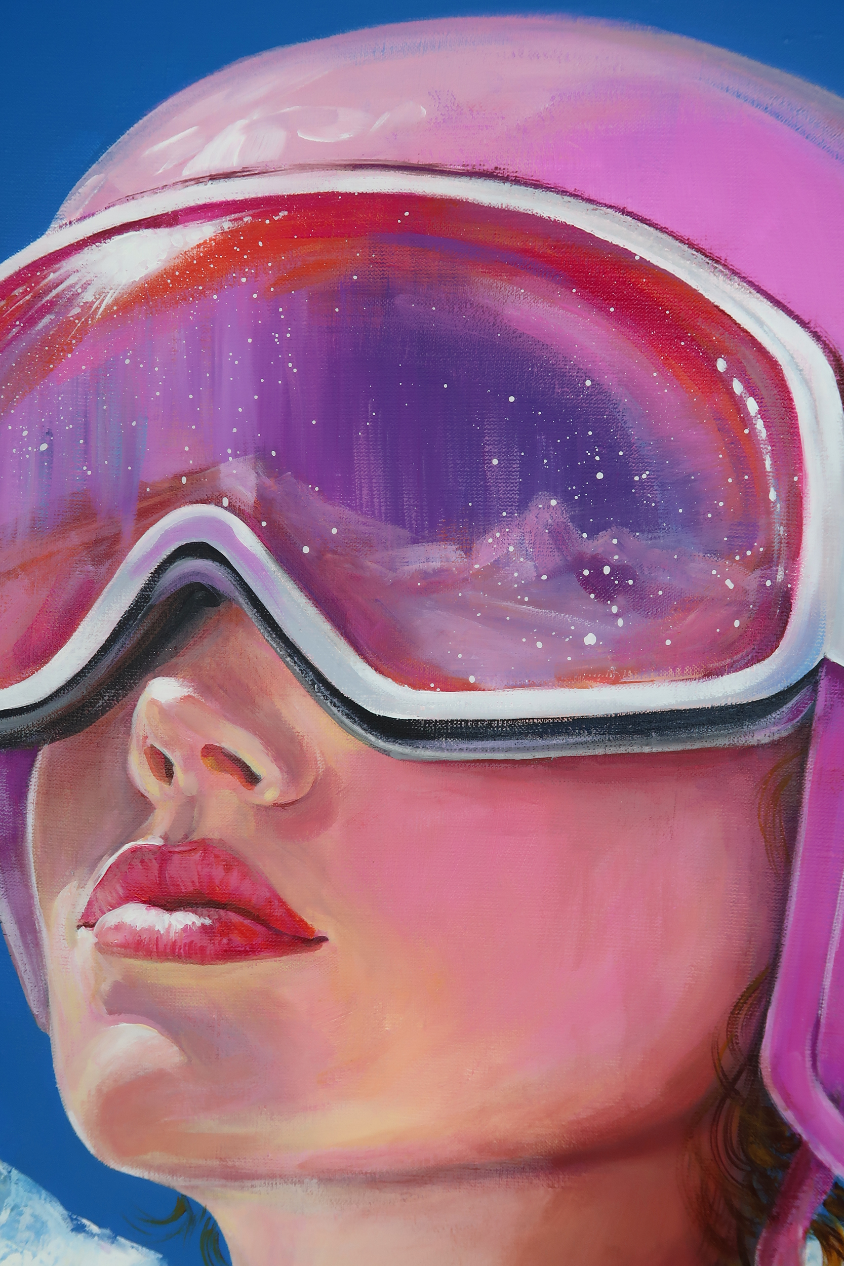 Особое художественное решение — звезды, отражённые в стекле маски, которые метафорически воплощают мечты, стремления и безграничные возможности человеческого духа. Фон работы выполнен в королевском голубом оттенке, создающем атмосферу глубины и пространства. В нижней части композиции горы, написанные смелыми пастозными мазками, придают картине динамику и текстурную насыщенность, усиливая ощущение силы и величия природы.