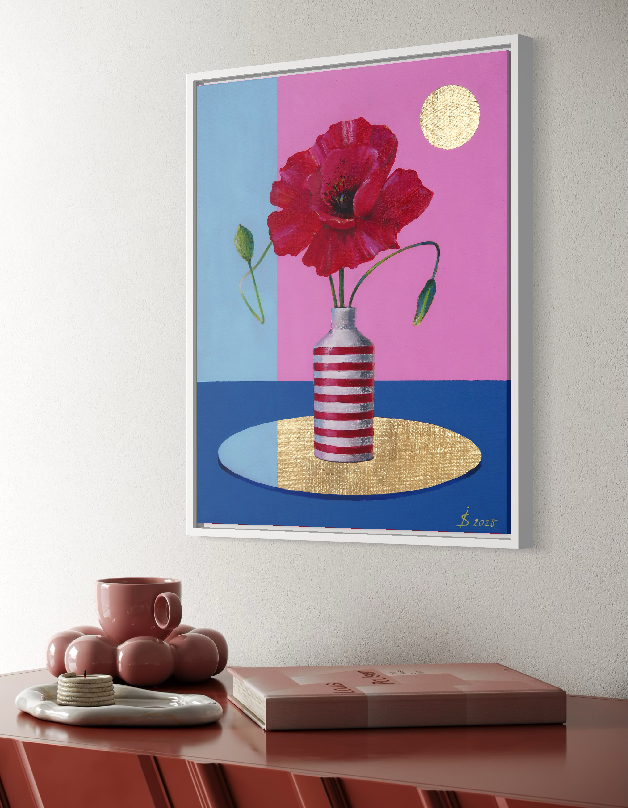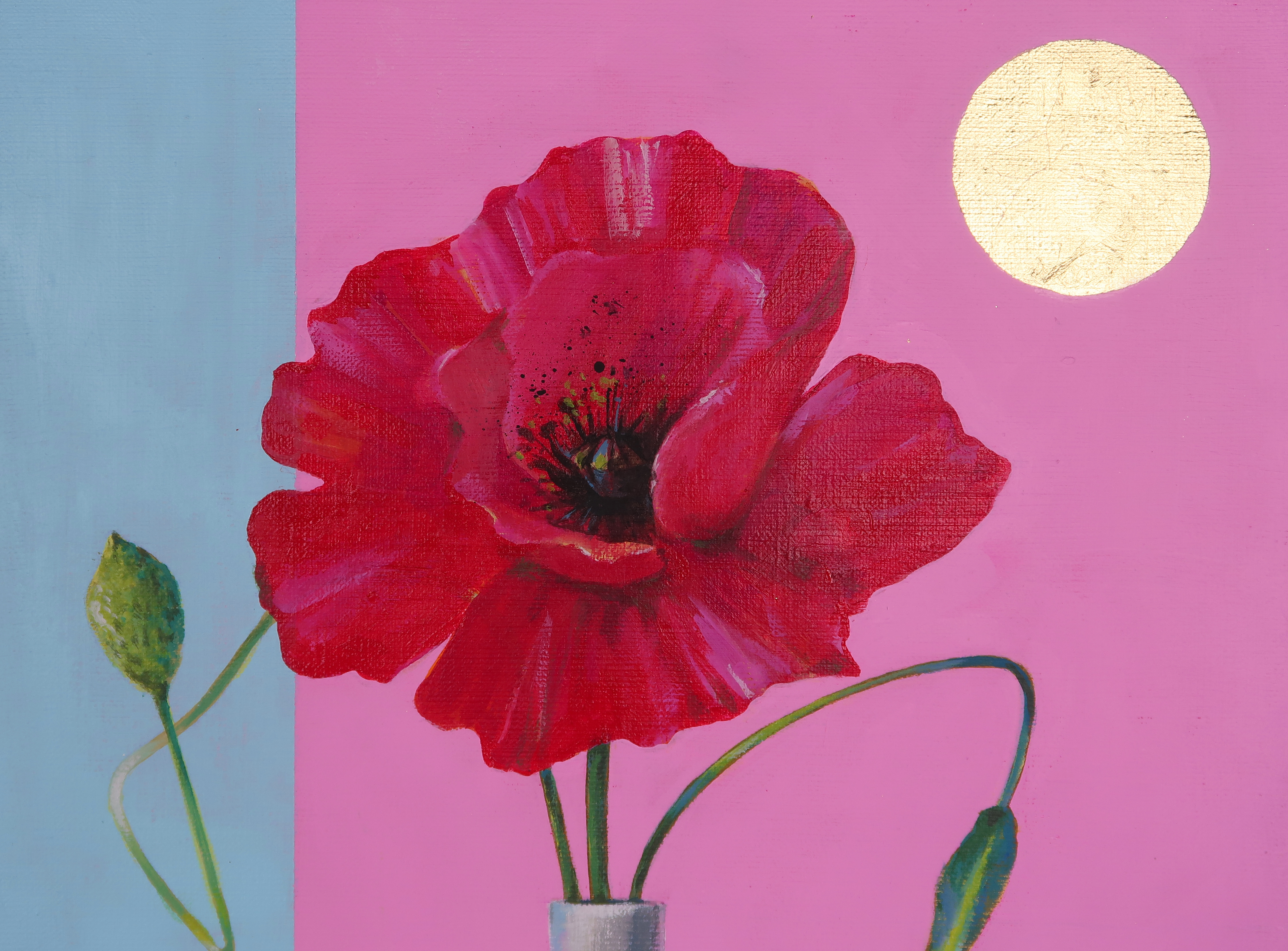 Красный мак, с его мимолетностью, и солнце, олицетворяющее вечность создают диалог, который позволяет нам глубже понять природу жизни. Жизнь и смерть сменяют друг друга, и такой круговорот длится целую вечность. Композиция картины — симметричная расстановка элементов на фоне с двумя цветами: бирюзовым и розовым. Общее настроение картины — спокойное и расслабленное. Свет, падающий на изображение, создает мягкие тени, которые добавляют картины глубины. Картина написана акрилом на холсте, также используется золочение поталью.