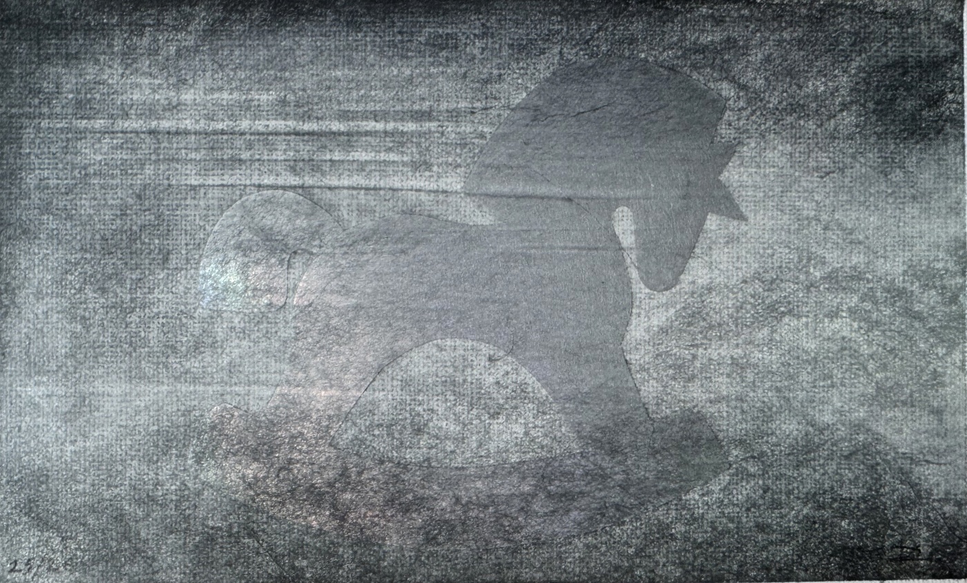 Образ советской лошадки-каталки интегрируется с современным символом, понятным новому поколению, переливаясь и исчезая, создавая эффект туманности. Тончайшая японская бумага предварительно тонируется в авторской технике и местами напоминает сотканную тончайшую вуаль.