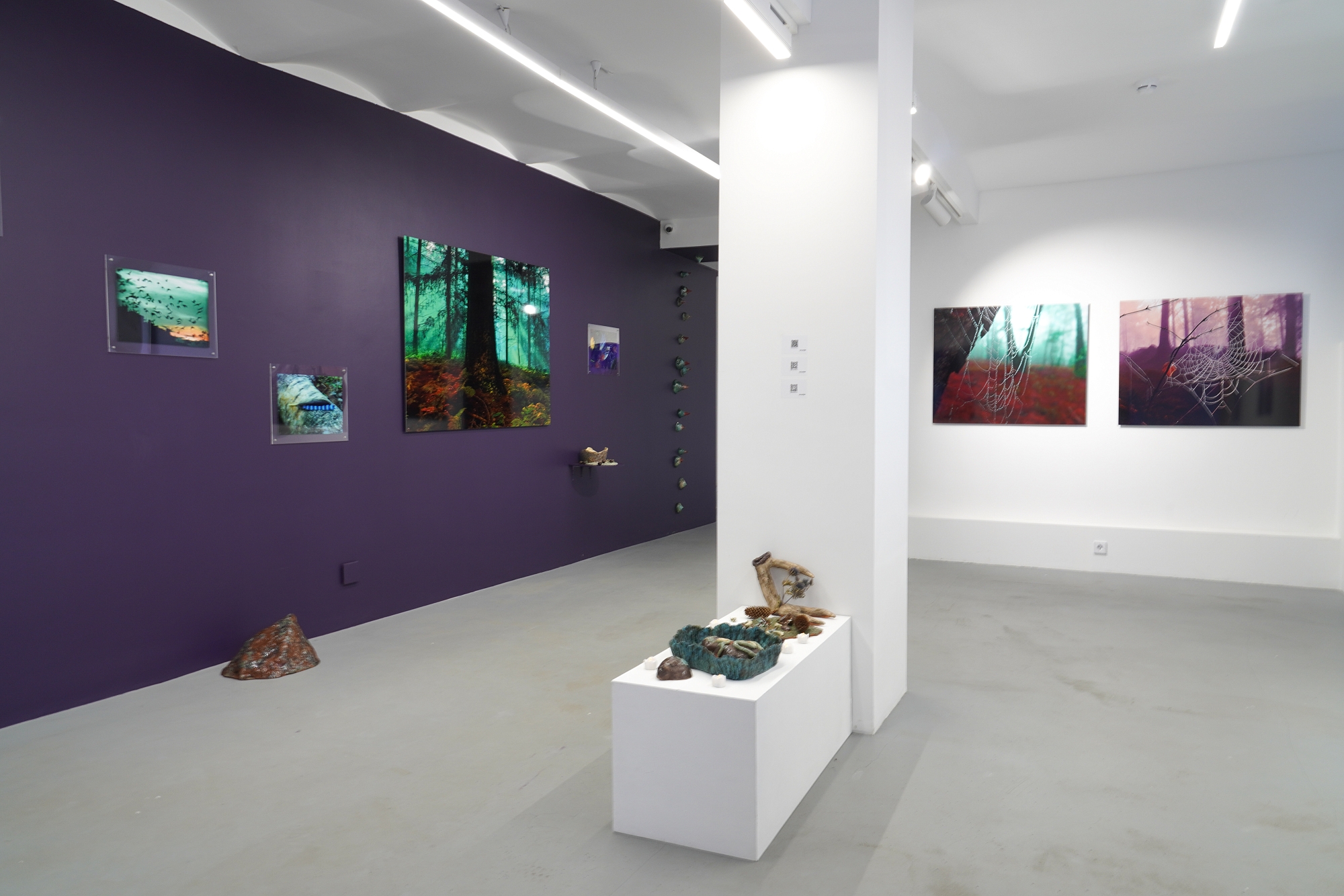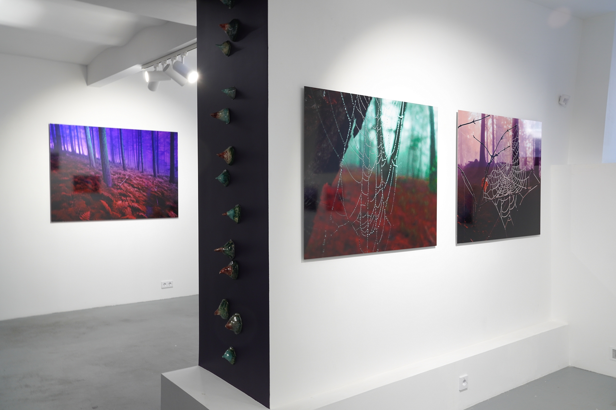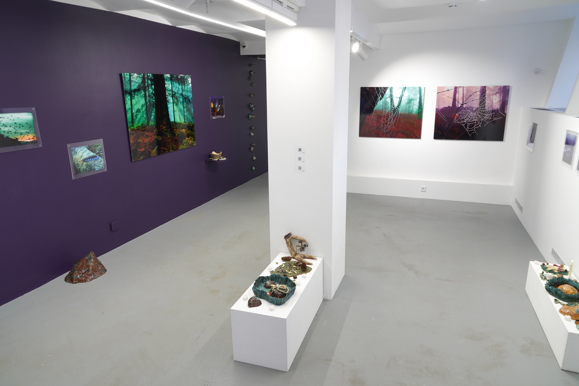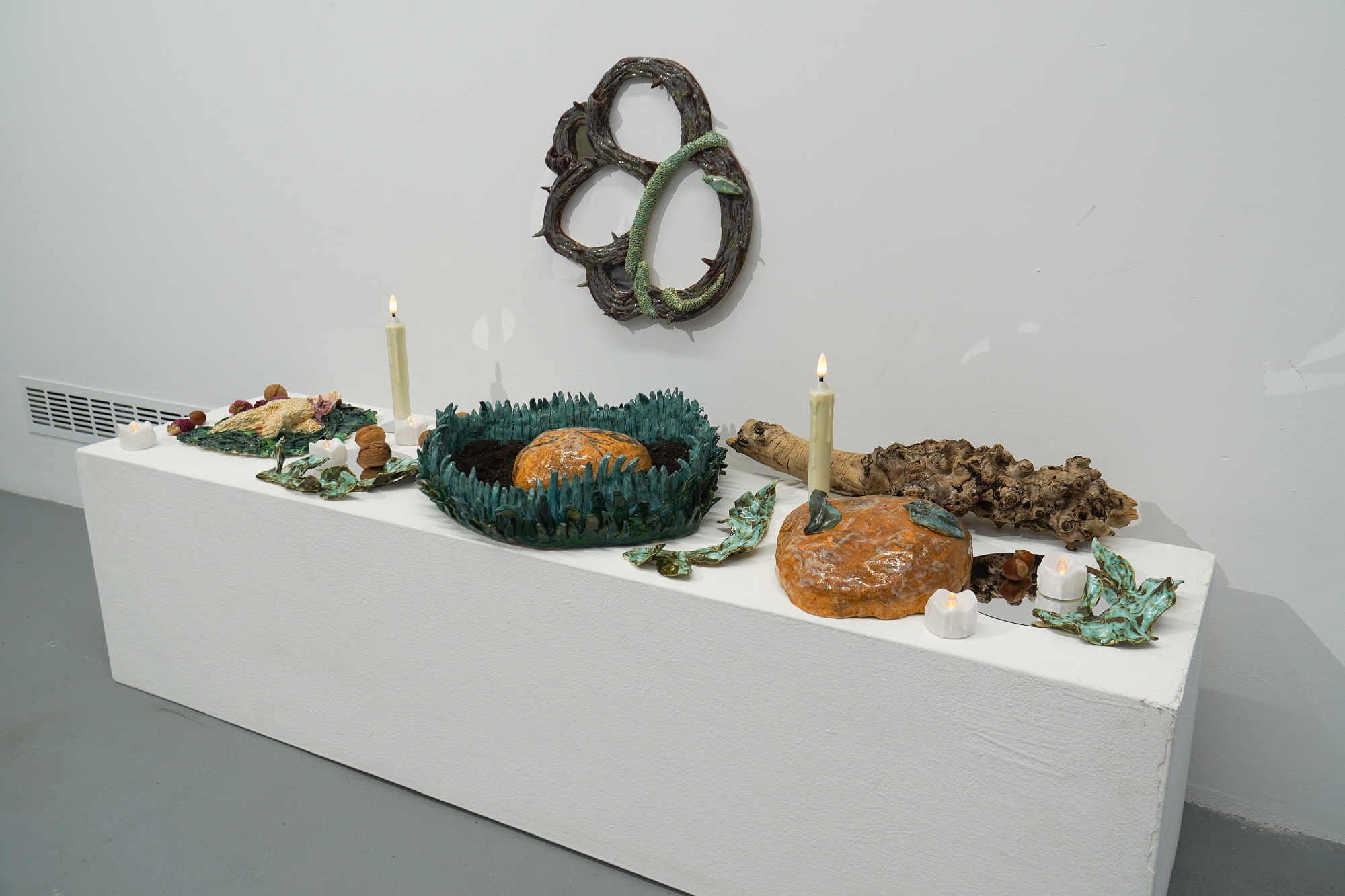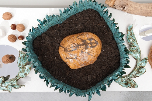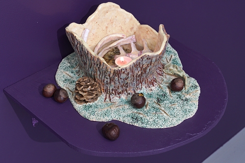 Дополняют выставку керамические работы Ольги Божко, чьи формы и фактуры тонко перекликаются с темой сумерек. Каждая скульптура — это своеобразный лесной алтарь – жертвенник, посвящённый суровым законам природы, как напоминание о жестокой красоте естественного отбора. А тонкие ароматы, наполняющие галерею узнаваемыми запахами сырой земли, свежего дождя, лесной хвои и дыма, дополняют чувственный опыт посетителей, предлагая зрителю прочувствовать и прожить завораживающее очарование сумеречного времени.