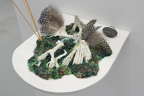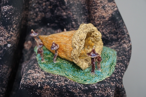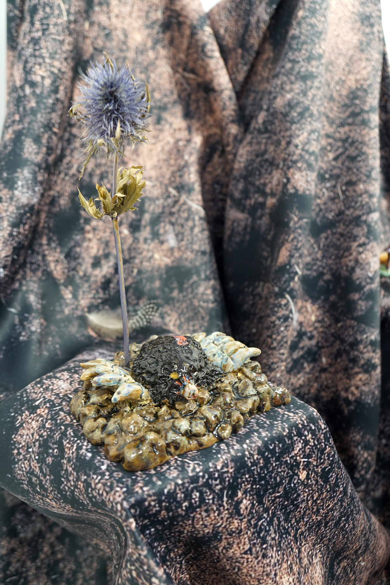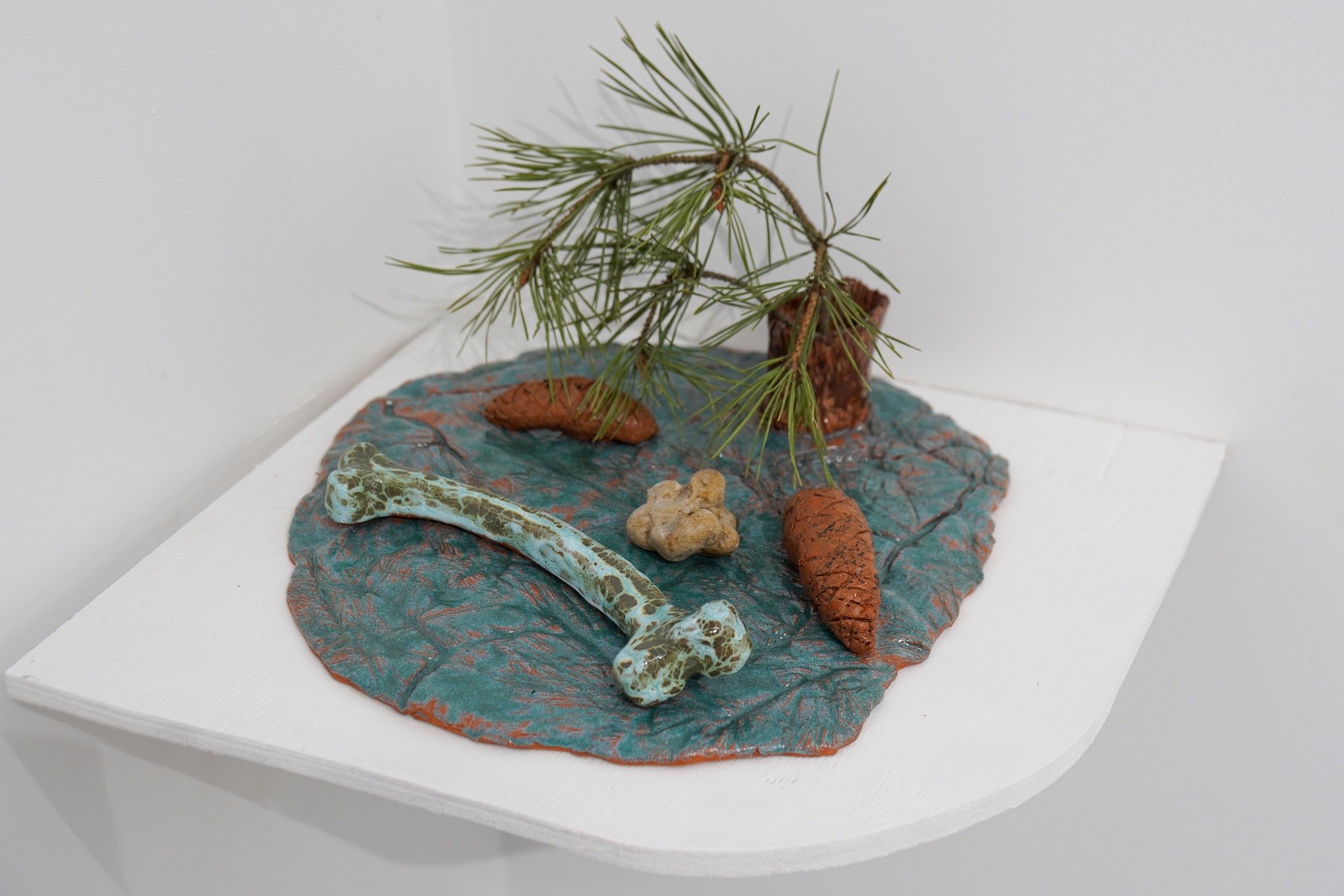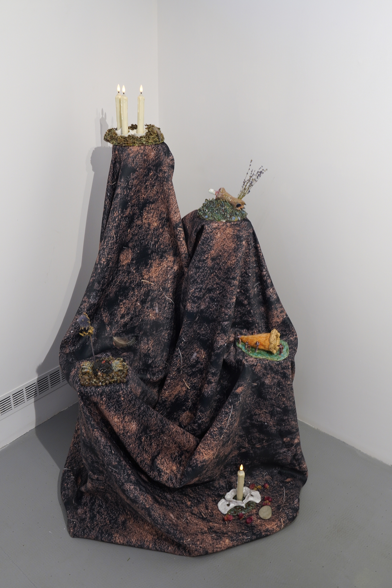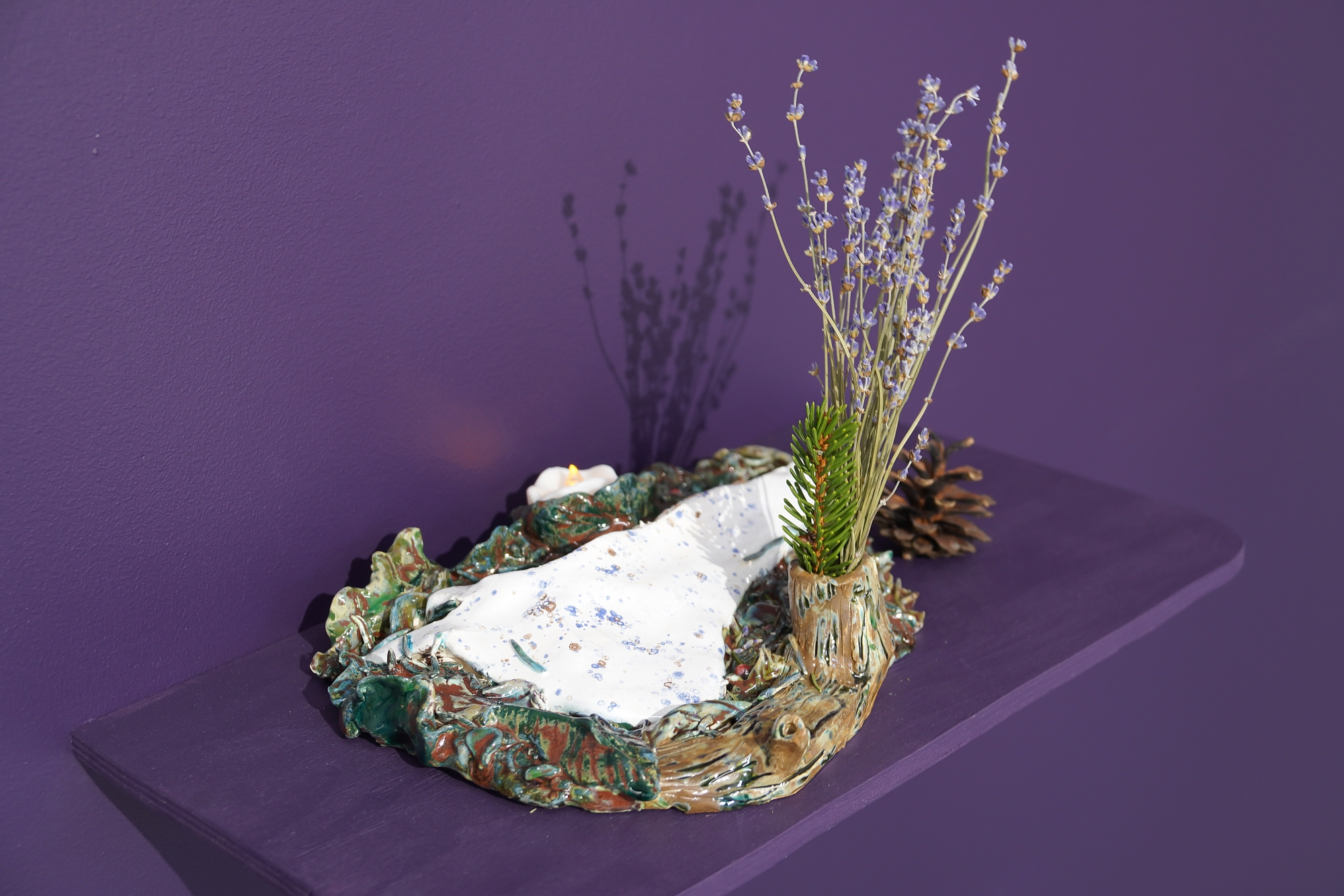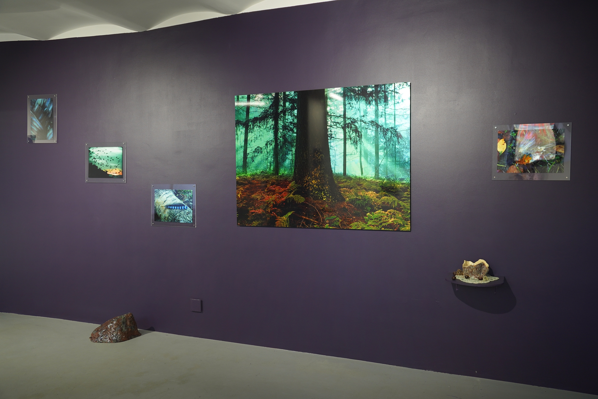 Дополняют выставку керамические работы Ольги Божко, чьи формы и фактуры тонко перекликаются с темой сумерек. Каждая скульптура — это своеобразный лесной алтарь – жертвенник, посвящённый суровым законам природы, как напоминание о жестокой красоте естественного отбора. А тонкие ароматы, наполняющие галерею узнаваемыми запахами сырой земли, свежего дождя, лесной хвои и дыма, дополняют чувственный опыт посетителей, предлагая зрителю прочувствовать и прожить завораживающее очарование сумеречного времени.